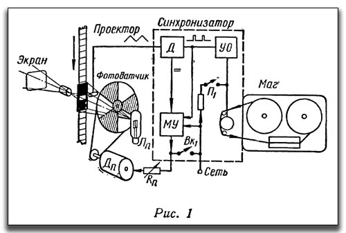 Синхронизация протяжки кинопленки в проекторе и магнитной ленты в магнитофоне может быть осуществлена двумя основными способами: механически и с помощью электронных устройств. Механические системы синхронизации отличаются простотой, но они не дают необходимой точности синхронизации при усушке или растягивании магнитной ленты. Электронные устройства обеспечивают высокую точность синхронизации и не требуют больших механических переделок кинопроектора и магнитофона.