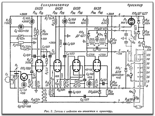 Питание синхронизатора осуществляется от автотрансформатора Атрп, имеющегося в кинопроекторе. Анодное напряжение получают от выпрямителя, собранного на диодах ДГ-Ц27 (/7//6, ПП7), которые можно смонтировать в самом проекторе. Нити накала всех ламп соединены последовательно и через гасящее сопротивление Я2Я подключаются параллельно проекционной лампе Лп (30 в).