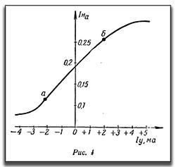 На рис. 4 приведена нагрузочная характеристика магнитного усилителя. Зависимость переменного тока через нагрузку /н, от постоянного управляющего тока /у. Как следует из этой характеристики, выходной ток, соответствующий номинальной скорости работы двигателя (точка б), получается при положительных значениях тока в обмотках управления. Для полной и надежной остановки двигателя по управляющим обмоткам необходимо пропустить ток в 2-2,5 ма обратного направления (точка а). Возможность изменения направления тока достигается тем, что обмотки управления включены не в разрыв анодной цепи Л4а, а между анодами Л4а и Л4б-