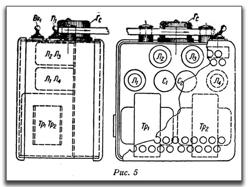Все детали электрического монтажа синхронизатора смонтированы на вертикальном шасси, закрепленном в металлическом кожухе размером 90 X 135 х 135 мм. Конструкция кожуха и расположение основных деталей указаны на рис. 5