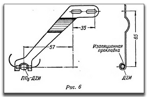 Германиевый диод ЯЯ5 (фотодатчик) при помощи фигурного кронштейна (рис. 6) крепится в проекторе к щитку, прикрывающему гасящее сопротивление неоновой лампы. Установка фотодатчика требует известной точности: диод должен хорошо освещаться проекционной лампой сквозь обтюратор, но не задевать его и не затенять изображение на экране.
